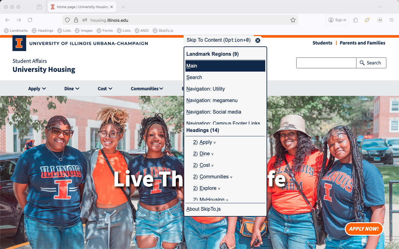 - When the “Skip To Content” menu button is visible when the page is loaded everyone can use it to identify and navigate to important regions on a page.